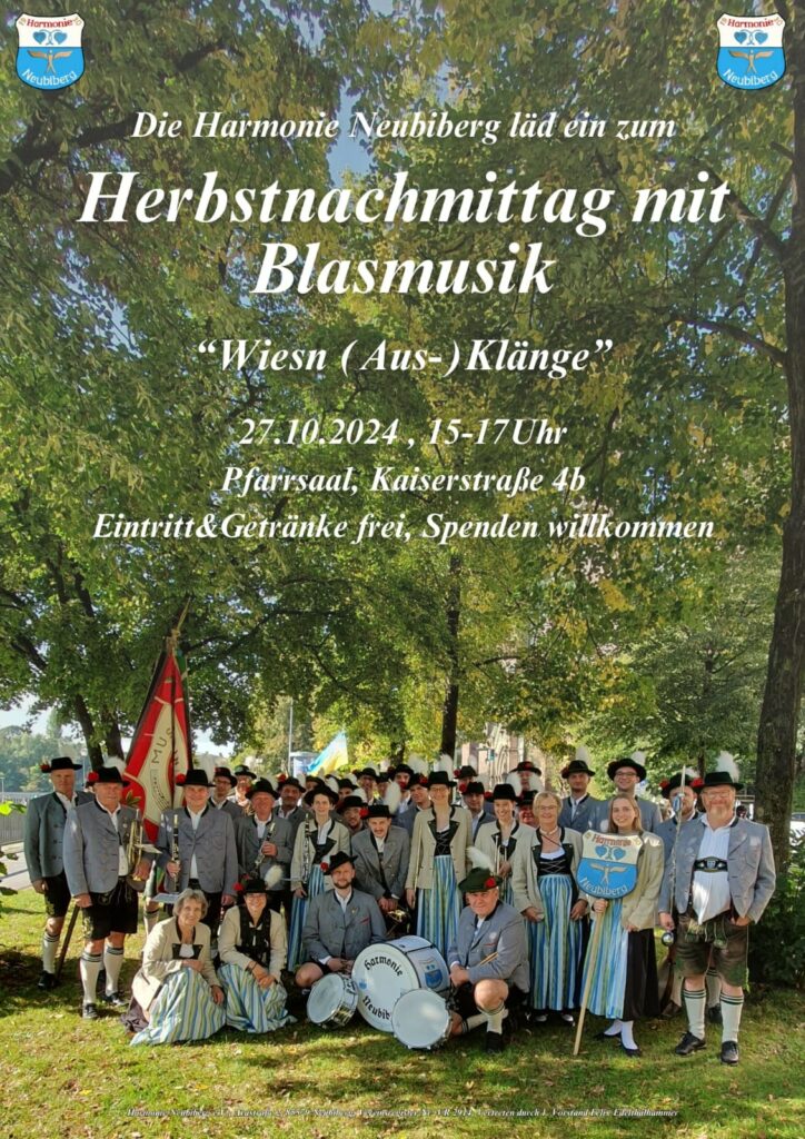 Herbstnachmittag mit Blasmusik Harmonie Neubiberg Datum 27.10.2024 Vorbei! Uhrzeit 15:00 Veranstaltungsort Pfarrheim Rosenkranzkönigin Kaiserstraße 4b, 85579 Neubiberg Teile diese Veranstaltung