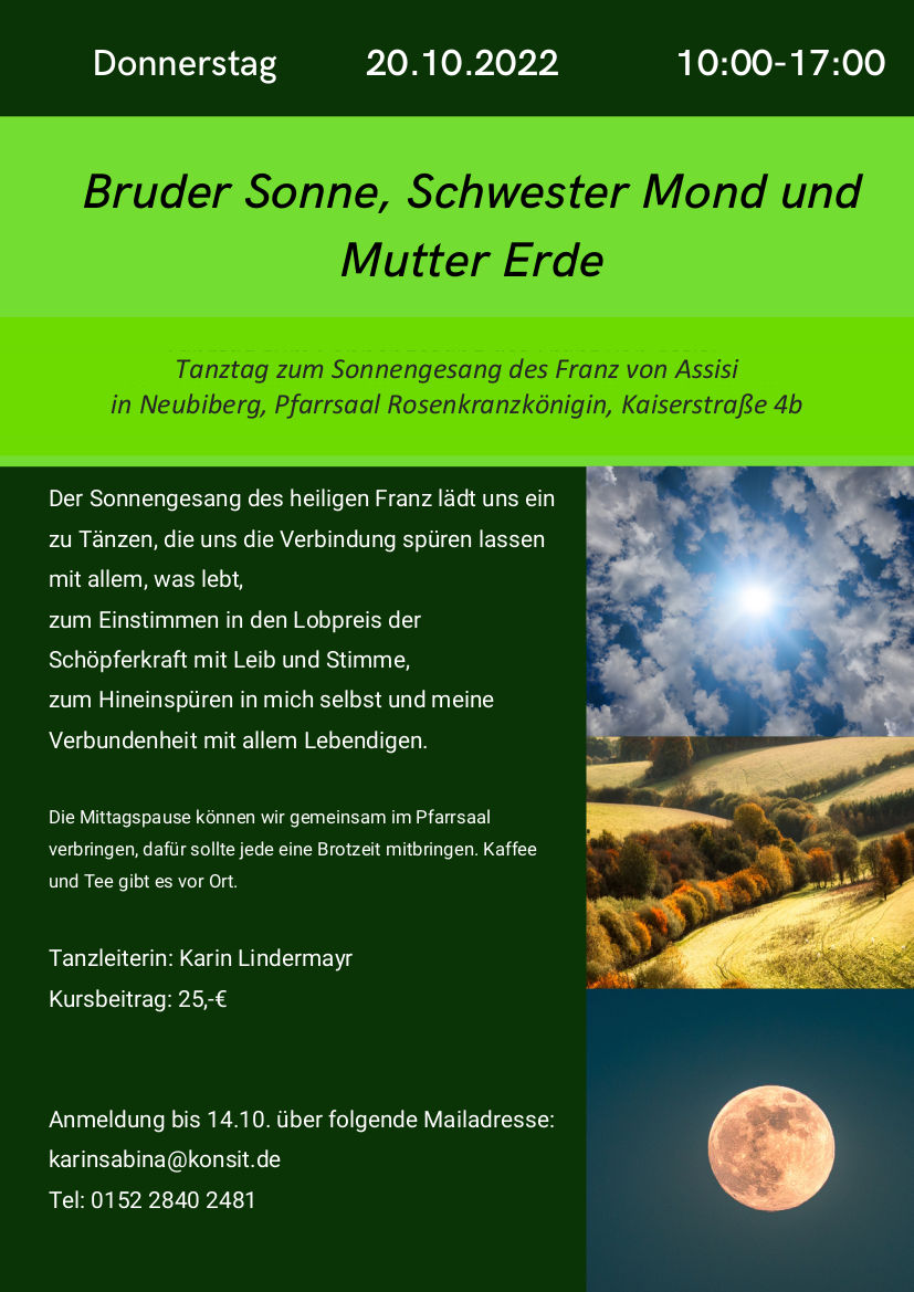 Der Sonnengesang des heiligen Franz lädt ein zu Tänzen, die die Verbindung spüren lassen mit allem, was lebt, zum Einstimmen in den Lobpreis der Schöpferkraft mit Leib und Stimme und zum Hineinspüren in sich selbst. Karin Lindermayr, Gemeindereferentin der Diözese, leitet den Tag und nimmt die Anmeldungen bis 14.10. unter karinsabina@konsit.de entgegen. Der Kursbeitrag beträgt 25 €.